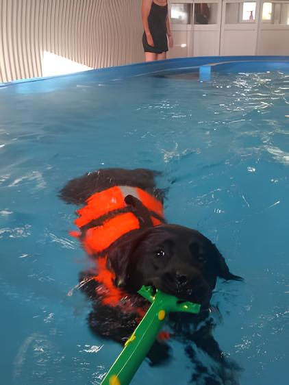 Bella har gigt og har svært ved at gå lange ture, men i vandet blomstrer hun op. Hun bevæger sig frit og virker så glad bagefter. Det er blevet ugens højdepunkt for os begge.